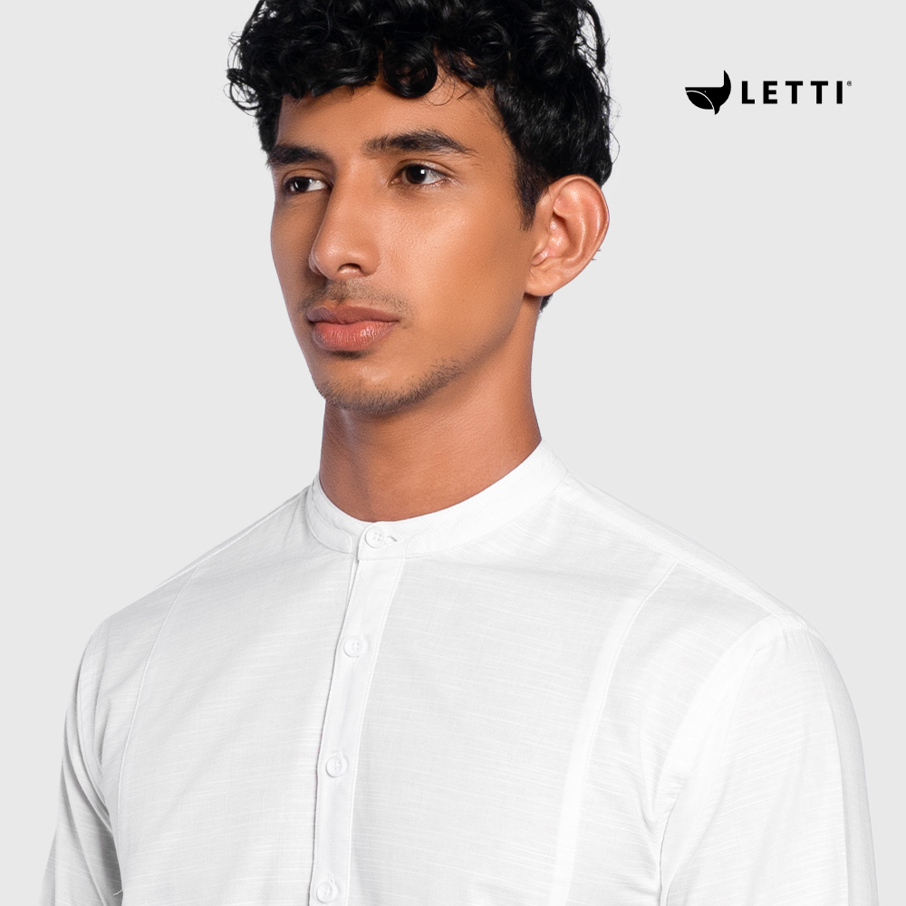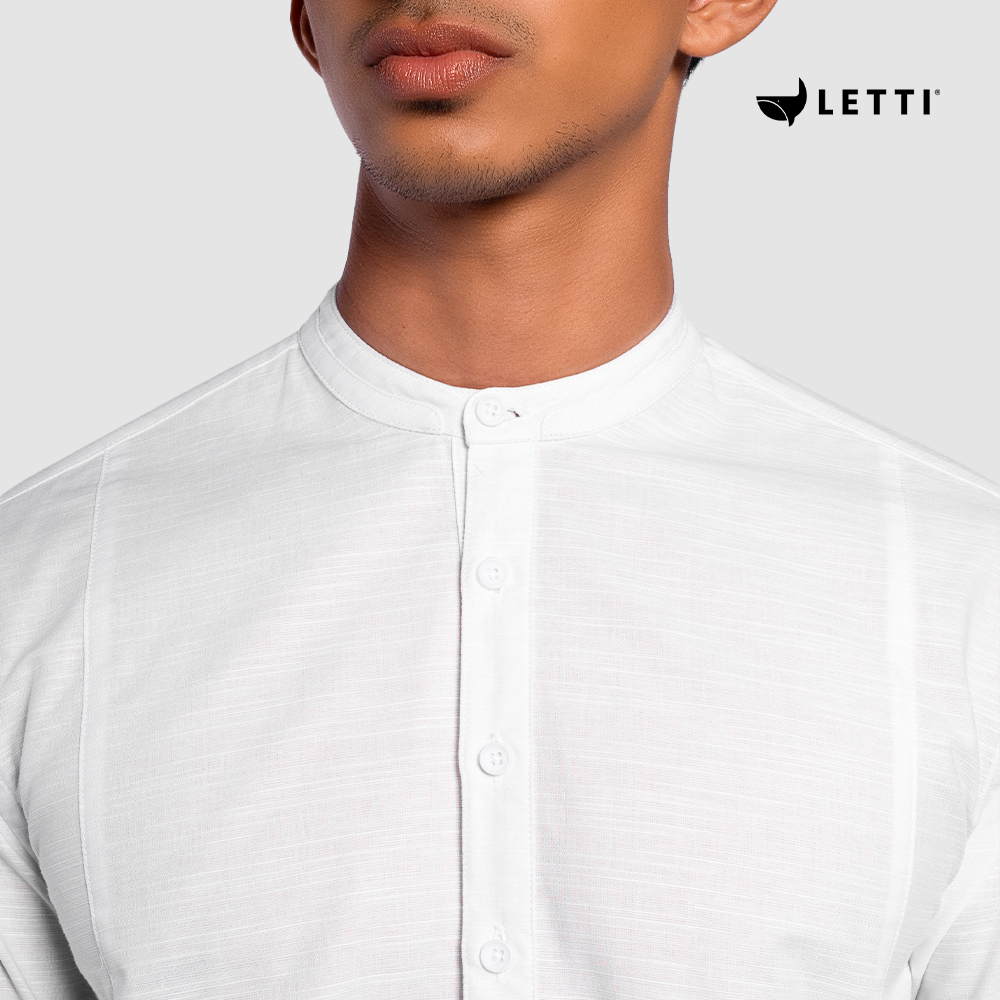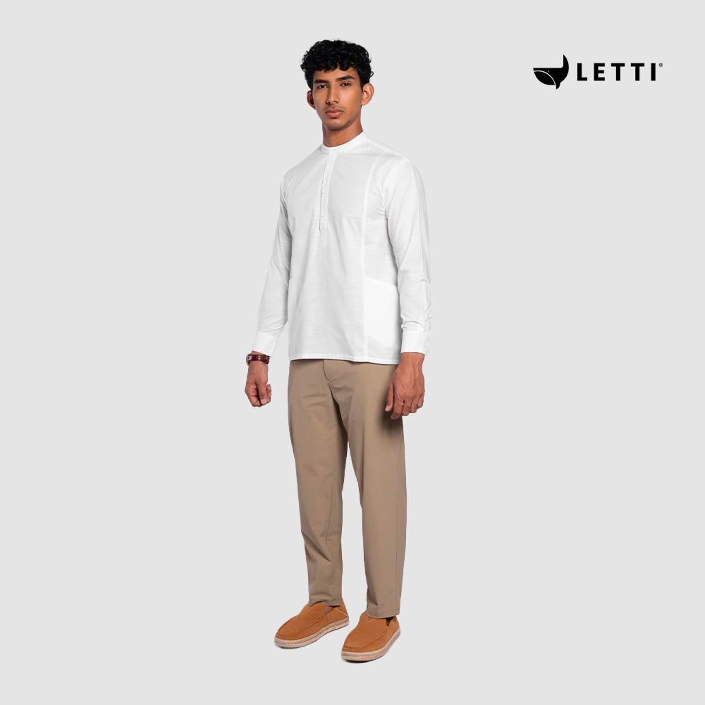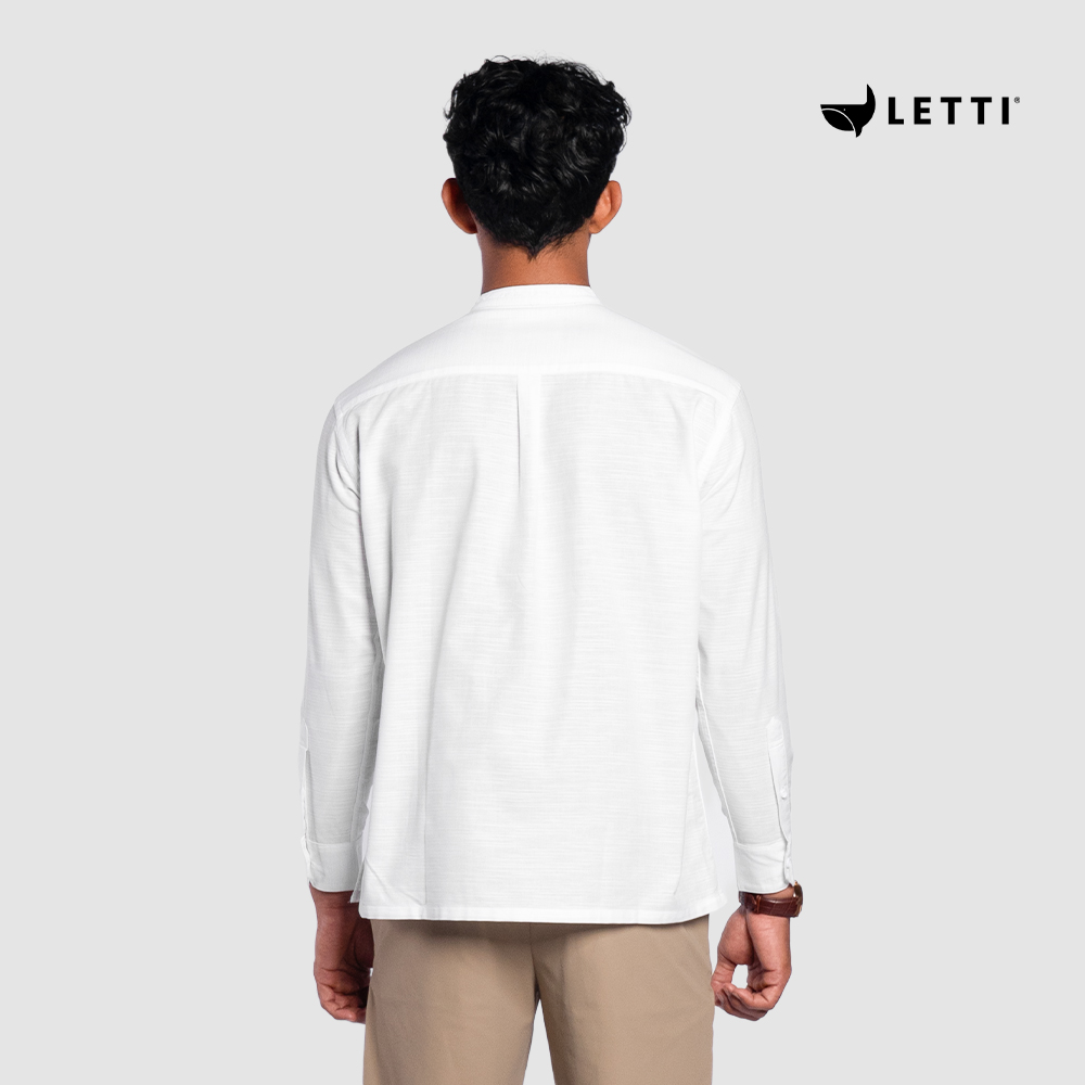 Menggunakan bahan Cotton slub 100% yang bertekstur alami, baju koko lengan panjang ini terasa adem, lembut, dan nyaman di kulit. Kerah shanghai dengan bukaan kancing menjaga tampilan tetap sopan, sementara variasi jahitan di bagian tengah memberi aksen visual yang halus. Kantong di sisi bawah kemeja menambah fungsi tanpa mengganggu tampilan keseluruhan.