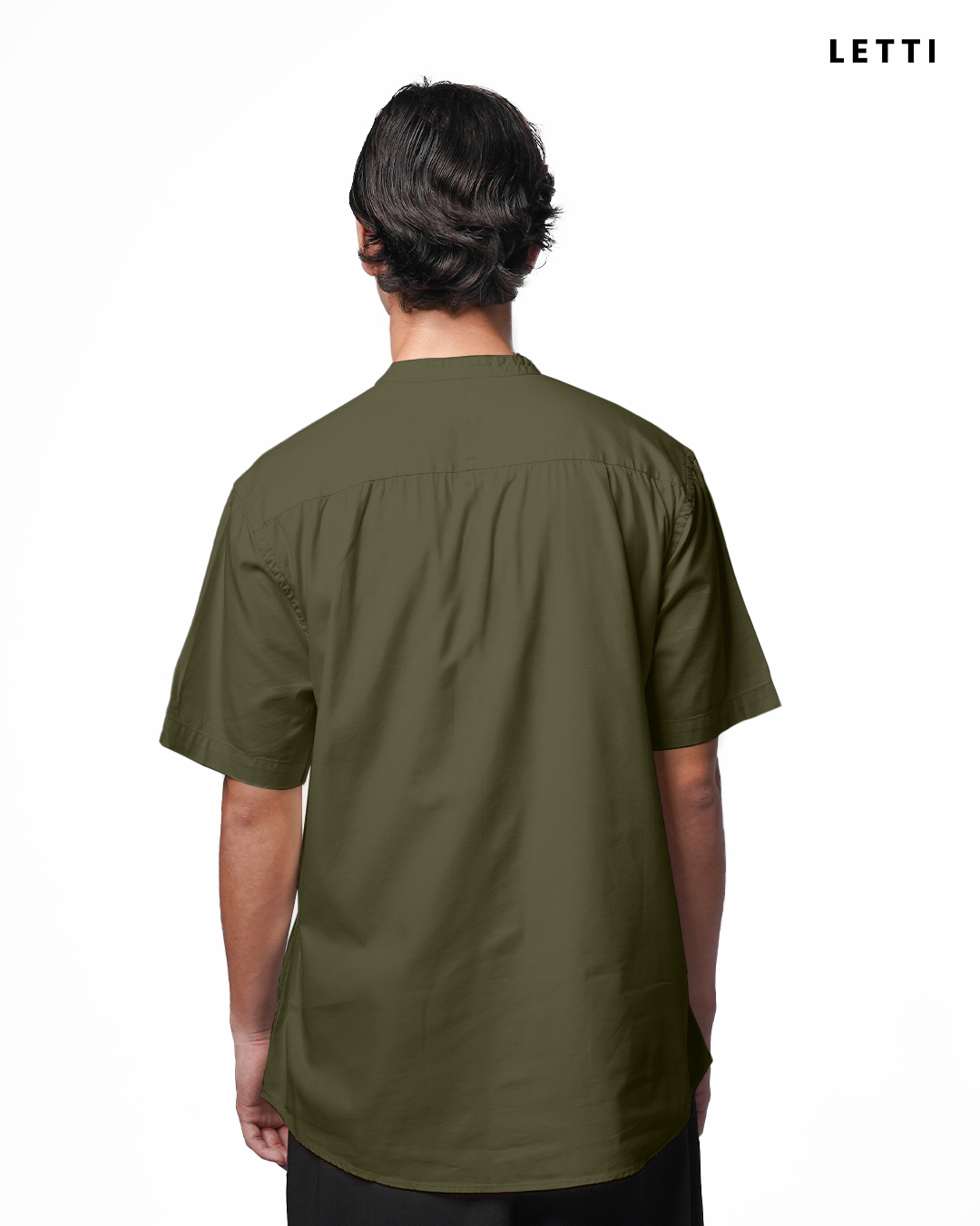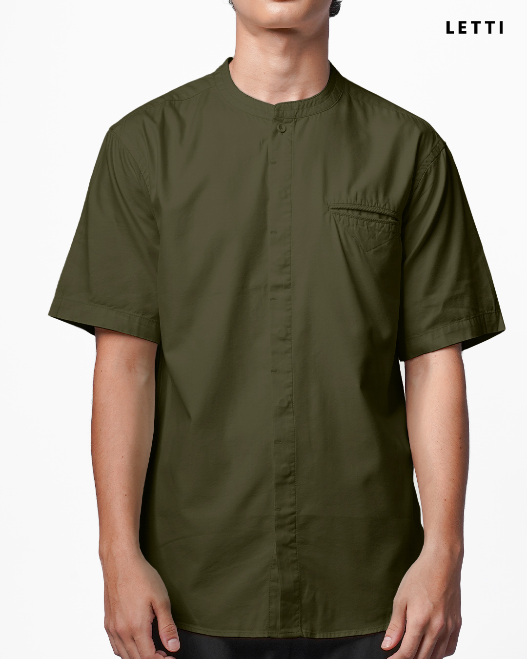Model: Kemeja Koko Lengan Pendek Pria dengan kerah shanghai ramping, kantong bobok, dan full hidden plaket di bagian depan.