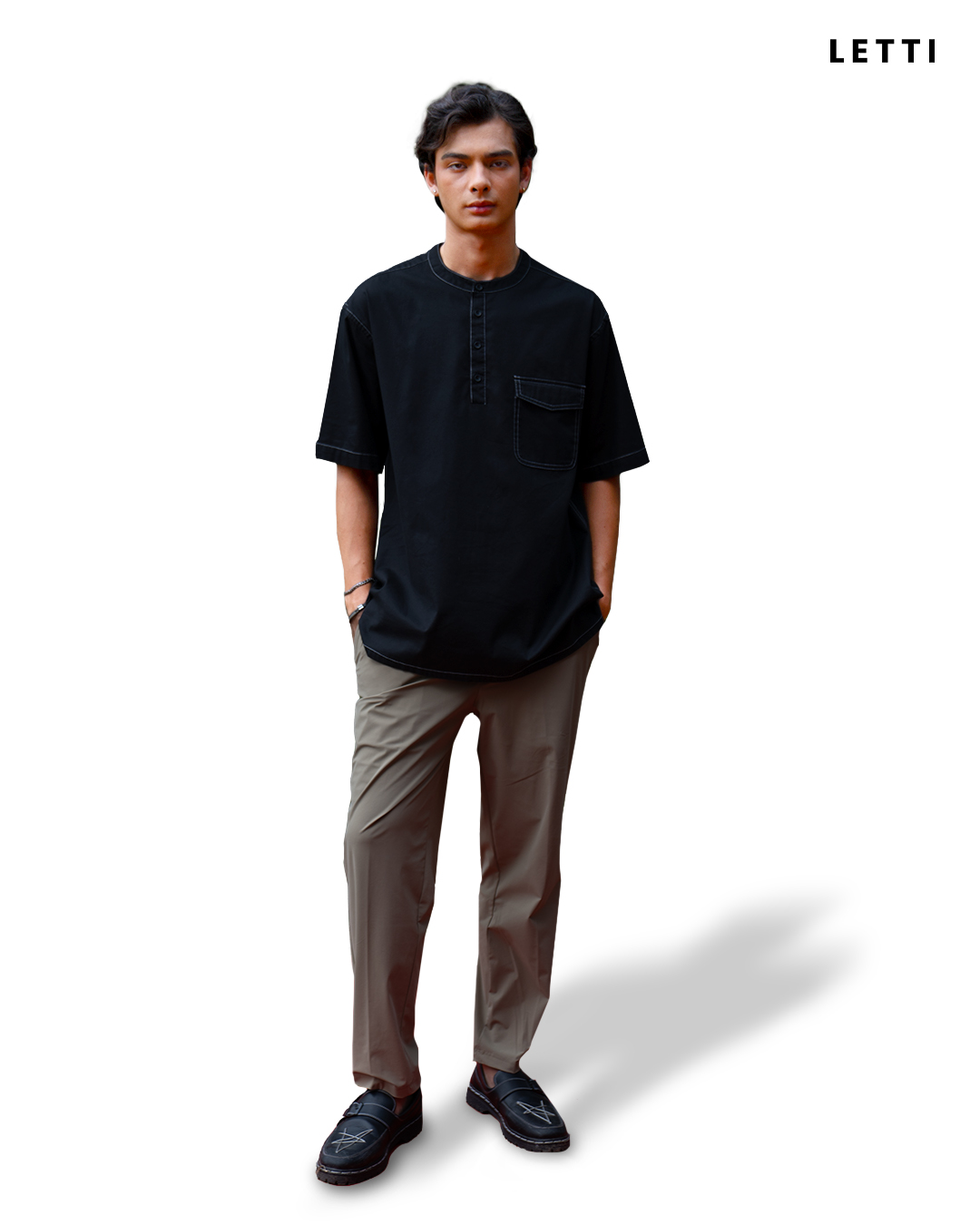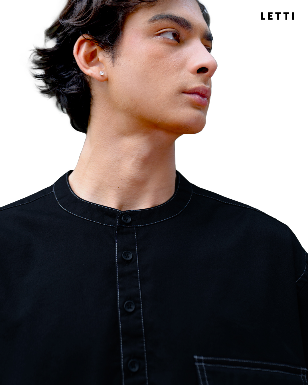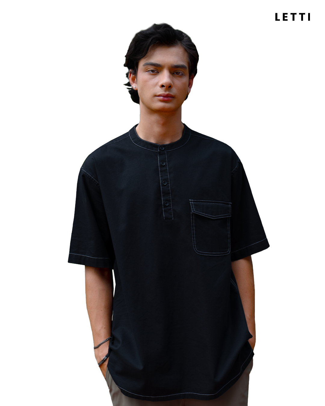 Ezra adalah kemeja berkerah bulat lengan pendek dengan tekstur katun premium dan detail jahitan kontras yang halus. Potongannya relaxed fit, dengan opening henley berkancing yang memberi kesan sederhana, bersih, dan berkarakter.