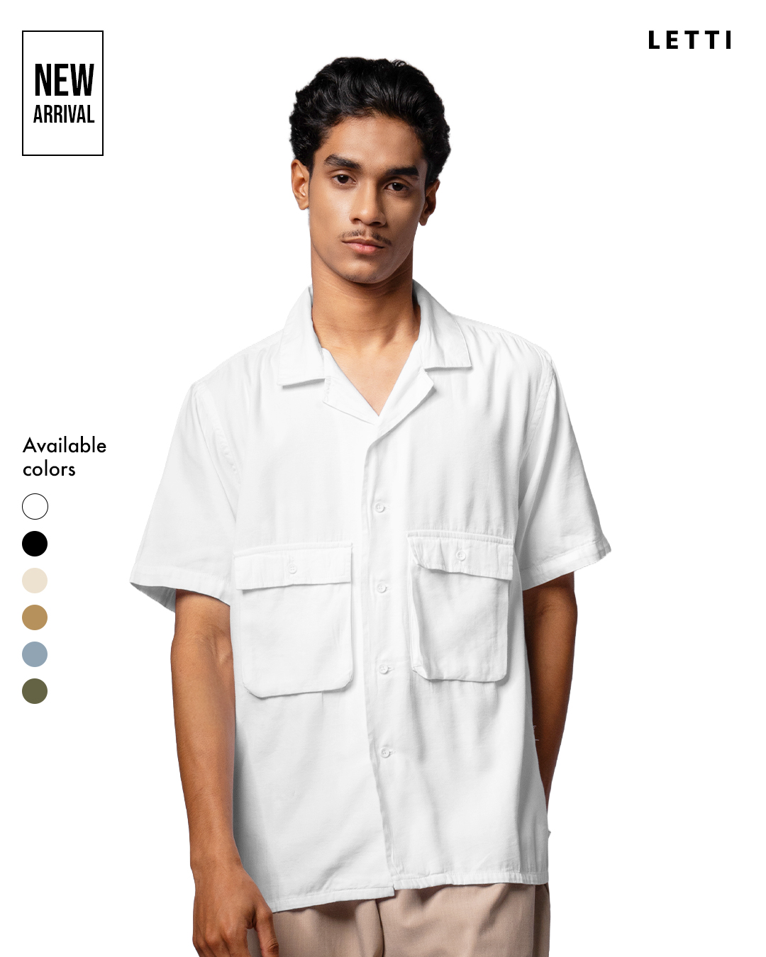 Model: Kemeja Lengan Pendek Pria dengan kerah V (bowling shirt style) dan dua kantong kargo berdetail flap & kancing.