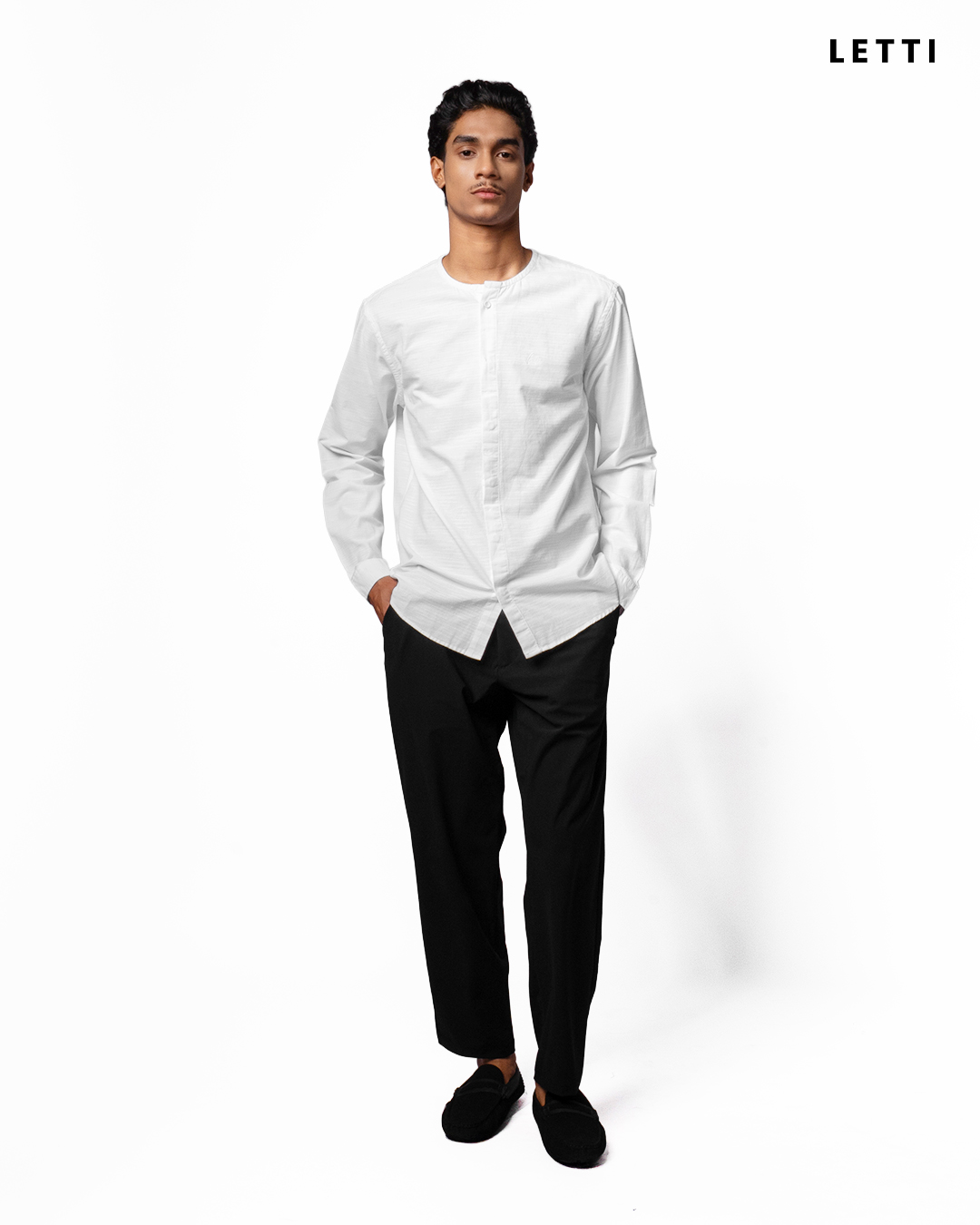 Kerah shanghai ramping memberi garis rapi di leher, tanpa kesan kaku. Plaket tertutup menjaga tampilan tetap clean, sementara satu kancing di bagian atas dibiarkan terbuka—memberi ruang bagi nuansa yang lebih santai tapi tetap terjaga. Bordir kecil LETTI di dada kiri hadir sebagai tanda—halus, tapi punya makna.